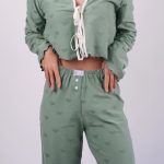 Ova elegantna i udobna pidžama u nježno zelenoj nijansi savršen je spoj stila i opuštenosti, osmišljena za mirne noći i ugodne trenutke kod kuće. Gornji dio pidžOame ima vezice koje ovaj set čine posebnim. Hlače su širokog kroja te omogućavaju potpunu slobodu kretanja. Tkanina je ukrašena suptilnim uzorcima srca, unoseći nježan i romantičan detalj. Materijal je mekan i lagan, pružajući savršenu udobost tokom nošenja. Ova pidžama je idealna za one koji vole da se osjećaju dotjerano čak i kod kuće, pružajući osjećaj luksuza i topline u svakom trenutku odmora.