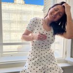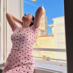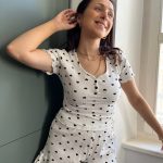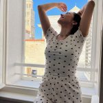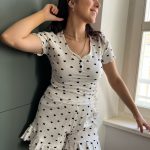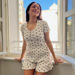 Ovaj set odiše svježinom i ženstvenošću, idealan za tople proljetne dane. Nježni dvodijelni komplet od laganog, rebrastog materijala u bijeloj boji, ukrašenom sitnim crnim srcima koji dodaju dašak razigranosti i romantike. Gornji dio je kratkih rukava s diskretnim valovitim rubovima, dok su kratke hlače visokog struka elegantno krojene i ukrašene volanima na rubovima, što dodatno naglašava opušten, ali dotjeran izgled.