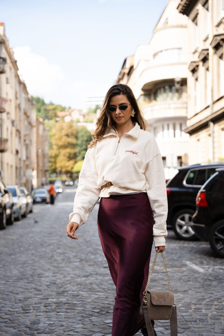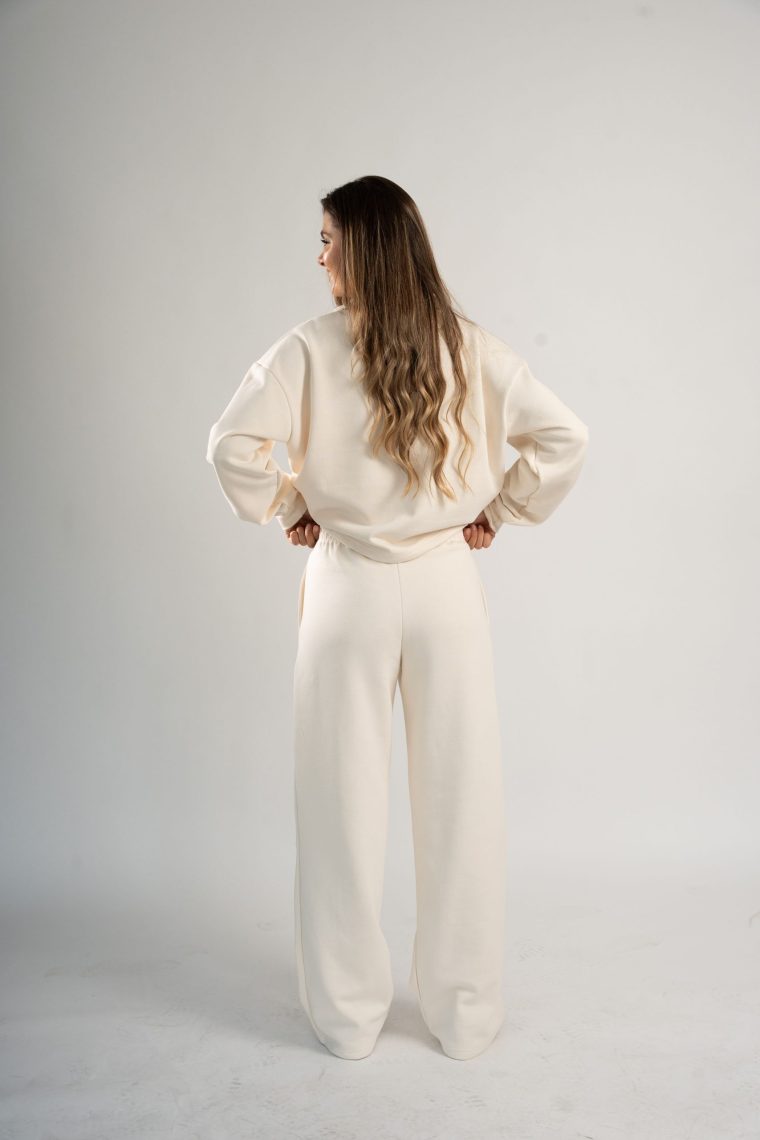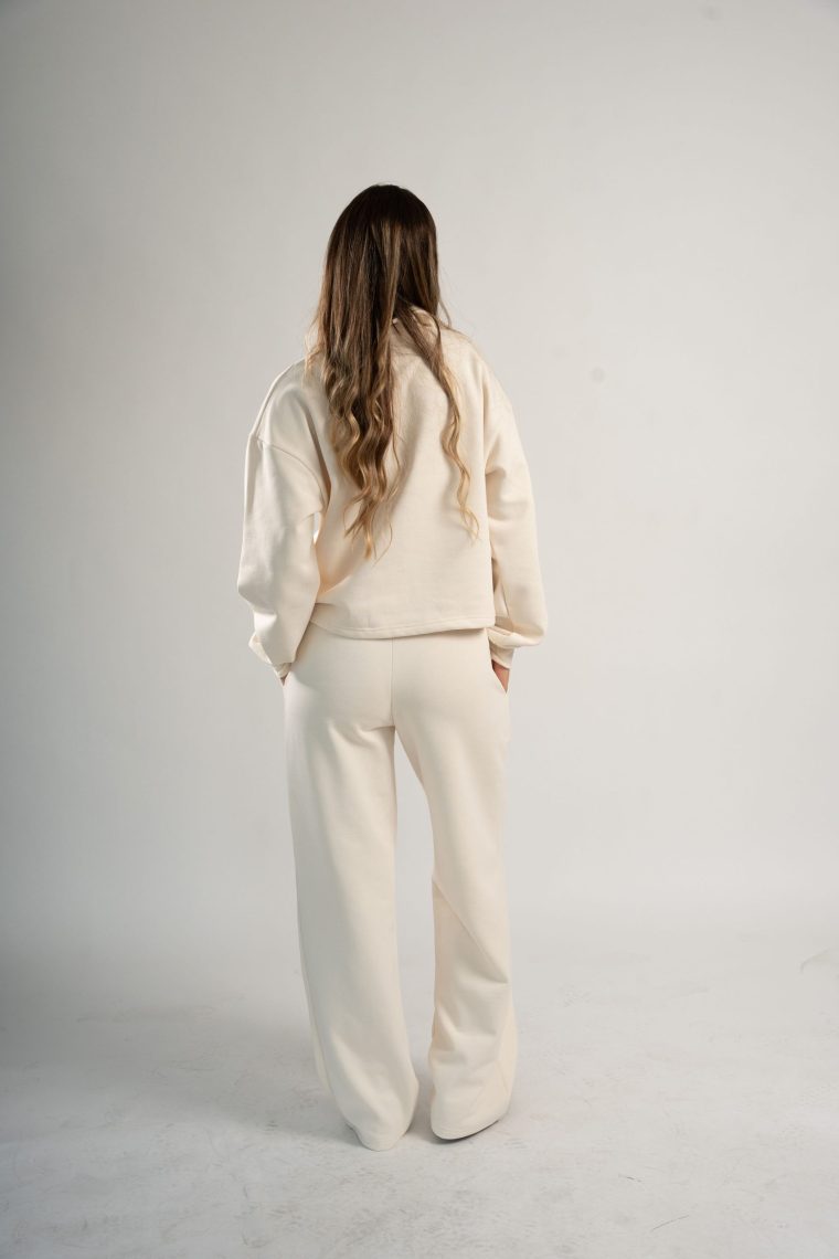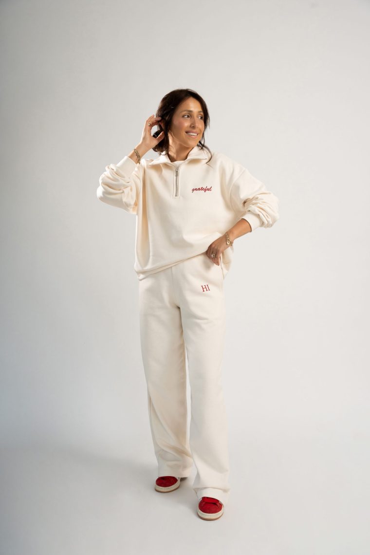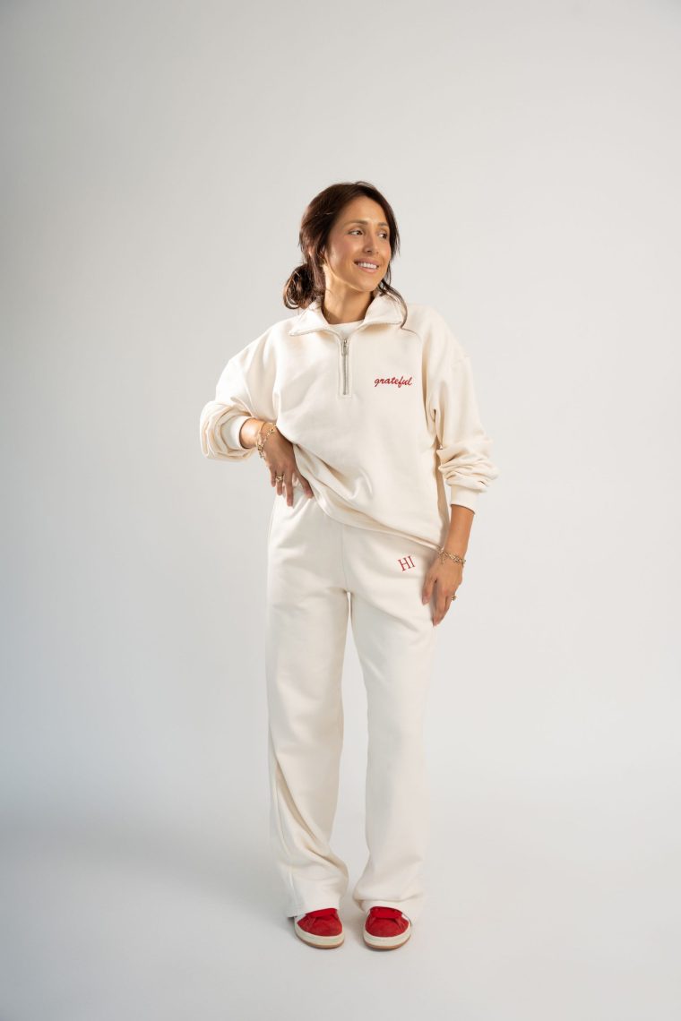 HI grateful trenerka  izrađena od mekanog, prijatnog materijala idealnog za hladne dane.Gornji dio krasi moderni polu-rajfešlus kroj sa istaknutim natpisom “grateful” na grudima, koji unosi dozu pozitivnosti u svaki dan. Široki kroj i blago spuštena ramena pružaju opušten izgled.Donji dio čini trenerka širokog kroja sa ravnim nogavicama, izrađene od mekane pamučne tkanine za udoban i ležeran izgled. Dostupna u više tonova koji se lako kombinuju sa svakodnevnim outfitima.