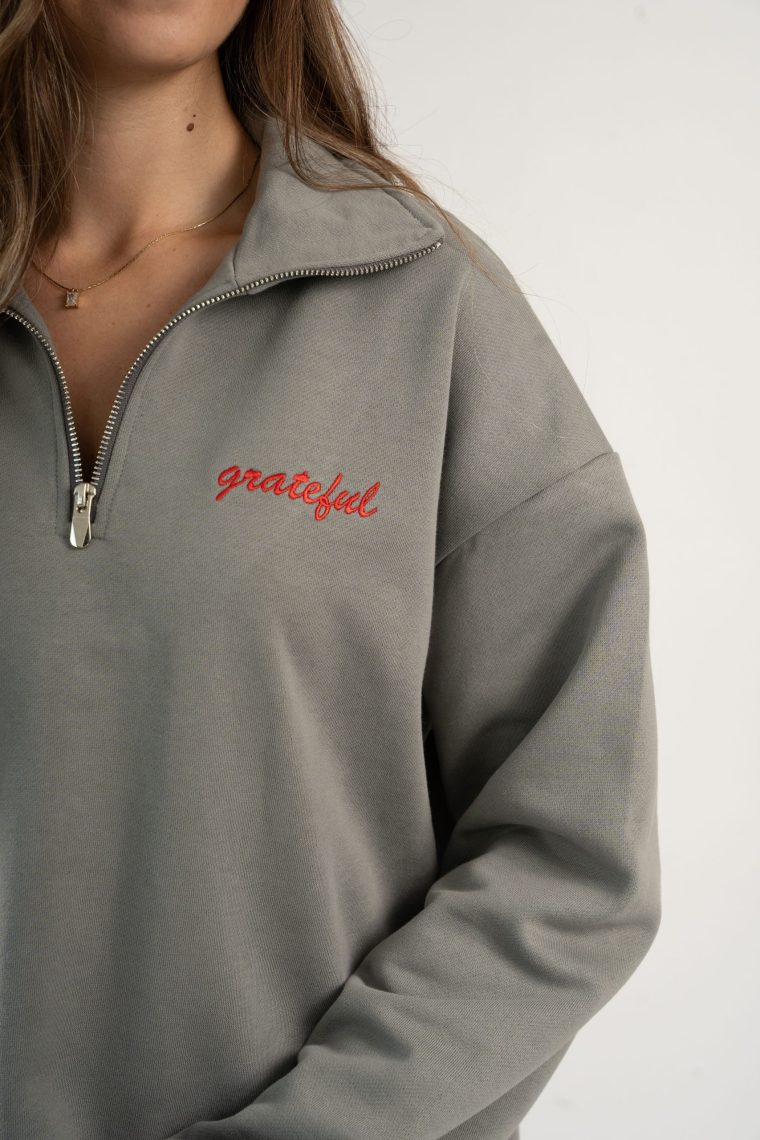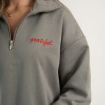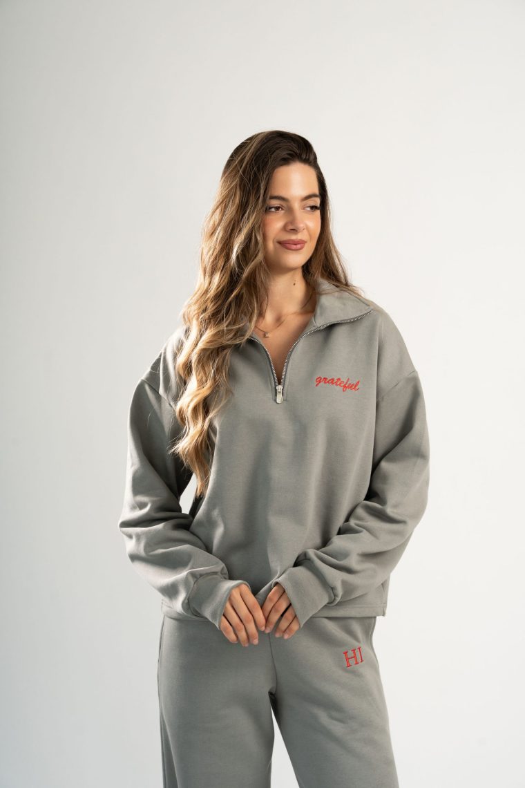 Gornji dio krasi moderni polu-rajfešlus kroj sa istaknutim natpisom “grateful” na grudima, koji unosi dozu pozitivnosti u svaki dan. Široki kroj i blago spuštena ramena pružaju opušten izgled.