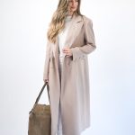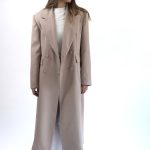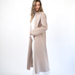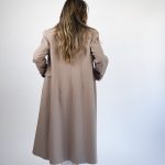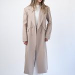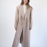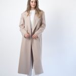 Hi mantil klasičnog bež , dugog kroja koji odiše elegancijom i bezvremenskim stilom. Izrađen od mekog, strukturiranog materijala koji savršeno pada i pruža osjećaj udobnosti i topline. Široki reveri i minimalističke linije daju mu sofisticiran izgled, dok dužina do gležnjeva vizualno izdužuje figuru i naglašava profinjenost.