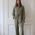 Kairo set odiše elegantnom jednostavnošću i bezvremenskim stilom. Izrađen od laganog i prozračnog materijala, savršen je za sve sezone. Košulja sa spuštenim ramenima, klasičnim kragnom i dugmićima u prirodnoj nijansi donosi sofisticiran izgled, dok blago lepršavi rukavi sa suptilnim volan detaljem dodaju ženstvenu notu. Pantalone širokog kroja s elastičnim pojasom pružaju udobnost i lakoću pokreta, a volan na dnu nogavica daje suptilan, ali upečatljiv modni pečat. Kombinuj ga uz patike za casual dnevni look ili uz cipele na petu za elegantnu večernju varijantu.