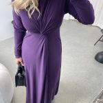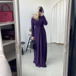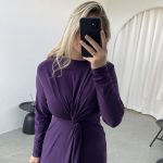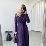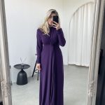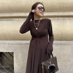 Katie duga smeđa haljina odiše elegancijom. Njen jednostavan kroj nježno obavija tijelo, a centralni čvor u predjelu struka ističe figuru na suptilan način, dajući joj tako specifičan izgled. Materijal je divan i mekan, lagano padajući niz tijelo, pruža potpunu slobodu pokreta.