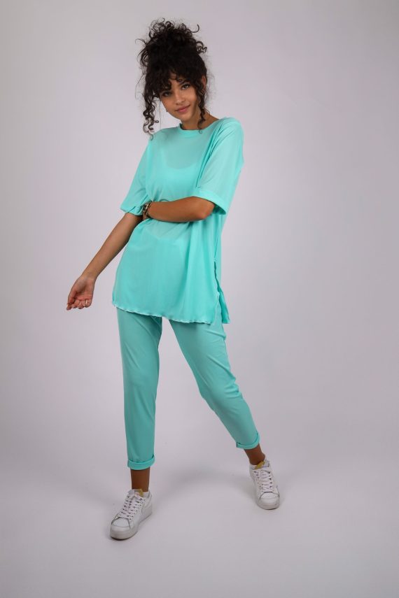 Upoznaj najudobniji basic komplet ove sezone – lagan, mekan i savršeno rastezljiv. Napravljen od kvalitetnog poliestera koji se ne gužva i lako održava, ovaj set je idealan za proljeće, ljeto i ranu jesen. Gornji dio je oversize kroja sa opuštenim rukavima, dok su donje hlače ravnog kroja sa savršenom dužinom koja vizuelno izdužuje noge.