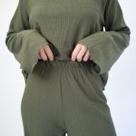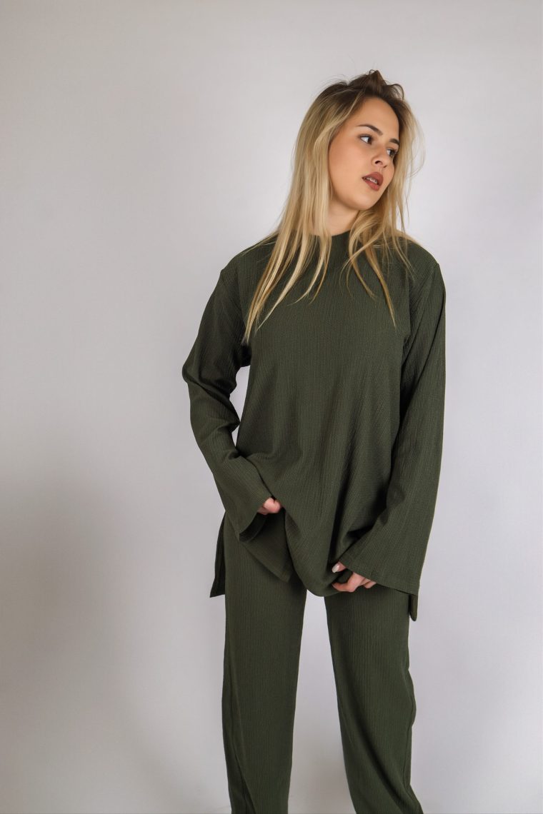 Neira set odiše nježnom profinjenošću i bezvremenskom elegancijom. Majica je raskošno lepršava sa zvonolikim rukavima. Neira majica je dugi rukav, a možete odabrati da li želite u dužoj ili kraćoj verziji.Visoki struk i široke nogavice na hlačama omogućavaju slobodno kretanje.