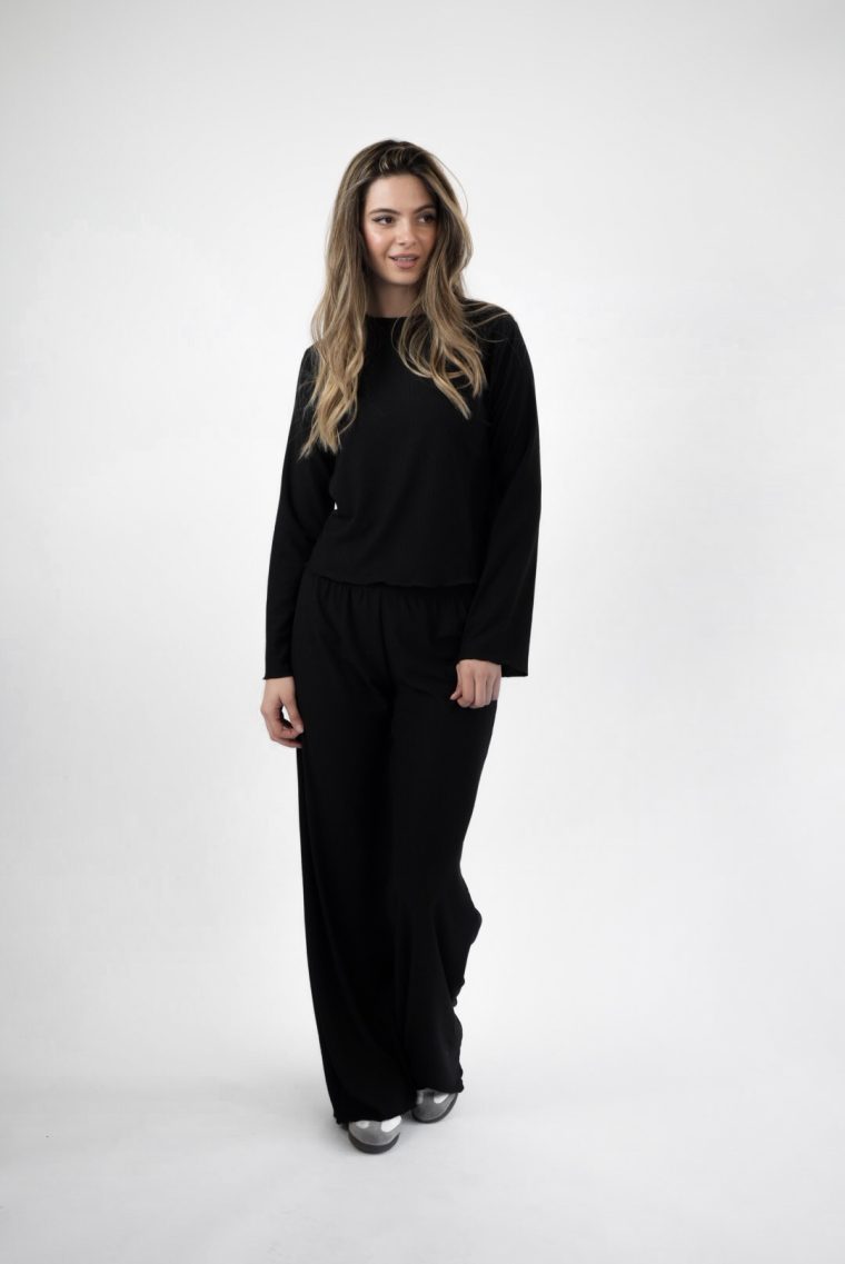 Neira set odiše nježnom profinjenošću i bezvremenskom elegancijom. Majica je raskošno lepršava sa zvonolikim rukavima. Neira majica je dugi rukav, a možete odabrati da li želite u dužoj ili kraćoj verziji. Visoki struk i široke nogavice na hlačama omogućavaju slobodno kretanje.