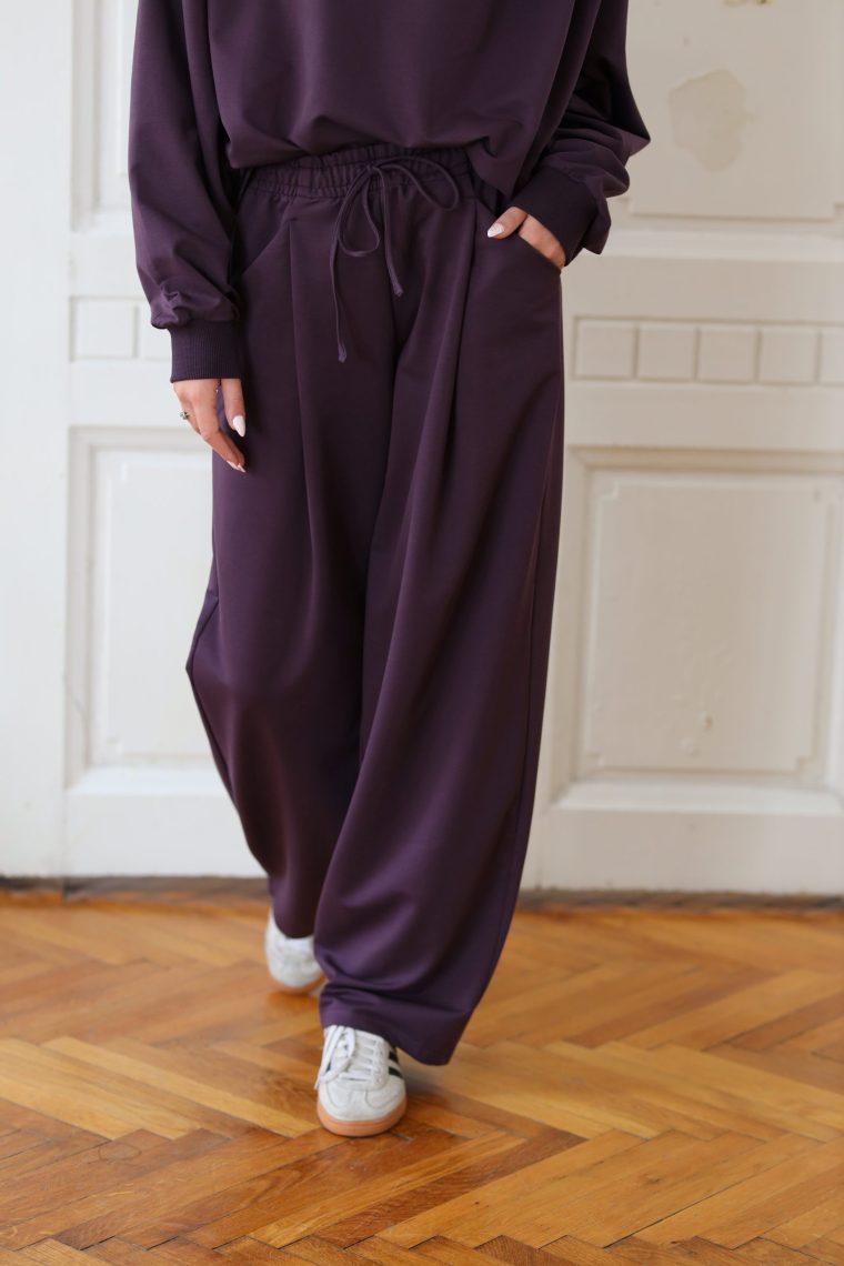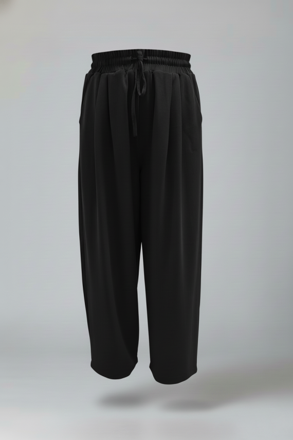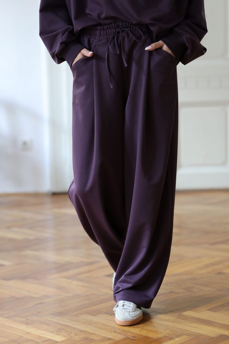 Hlače su širokog kroja s vezicom na struku, što omogućava savršeno prijanjanje i dodatnu prilagodbu. Idealne su za opuštanje kod kuće, ali i za šetnje i neformalne izlaske, uz osjećaj lakoće pri svakom koraku.