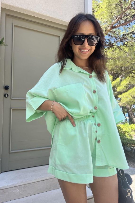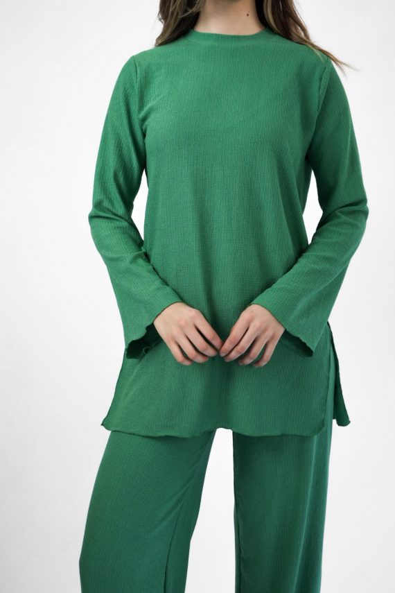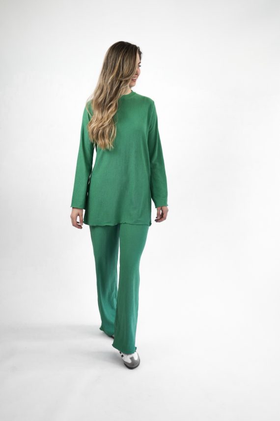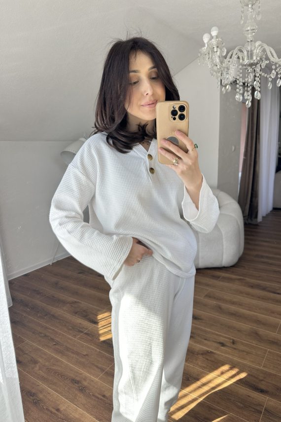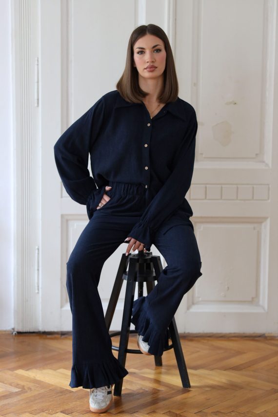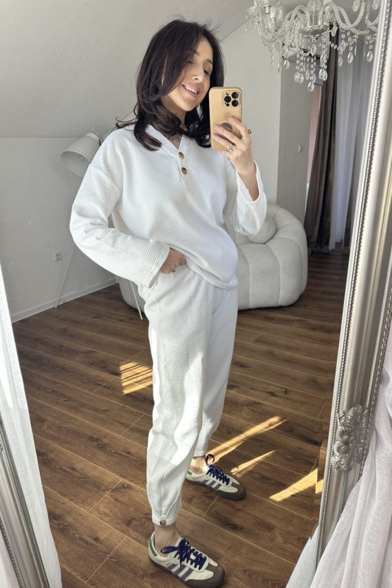 Predstavljamo vam udoban i elegantan set, savršen spoj stila i udobnosti za svakodnevno nošenje. Ovaj komplet sastoji se od opuštene majice dugih rukava i ravnih hlača visokog struka, izrađenih od mekog materijala koji pruža osjećaj ugode tokom cijelog dana.