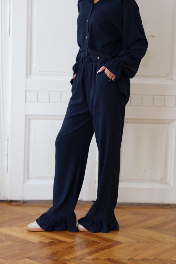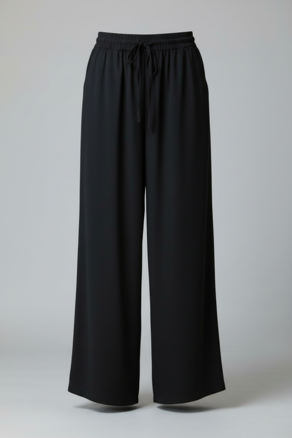 Hlače su širokog kroja s vezicom na struku, što omogućava savršeno prijanjanje i dodatnu prilagodbu. Idealne su za opuštanje kod kuće, ali i za šetnje i neformalne izlaske, uz osjećaj lakoće pri svakom koraku.