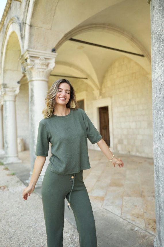 Predstavljamo vam udoban i elegantan set, savršen spoj stila i udobnosti za svakodnevno nošenje. Ovaj komplet sastoji se od opuštene majice dugih rukava i ravnih hlača visokog struka, izrađenih od mekog materijala koji pruža osjećaj ugode tokom cijelog dana.